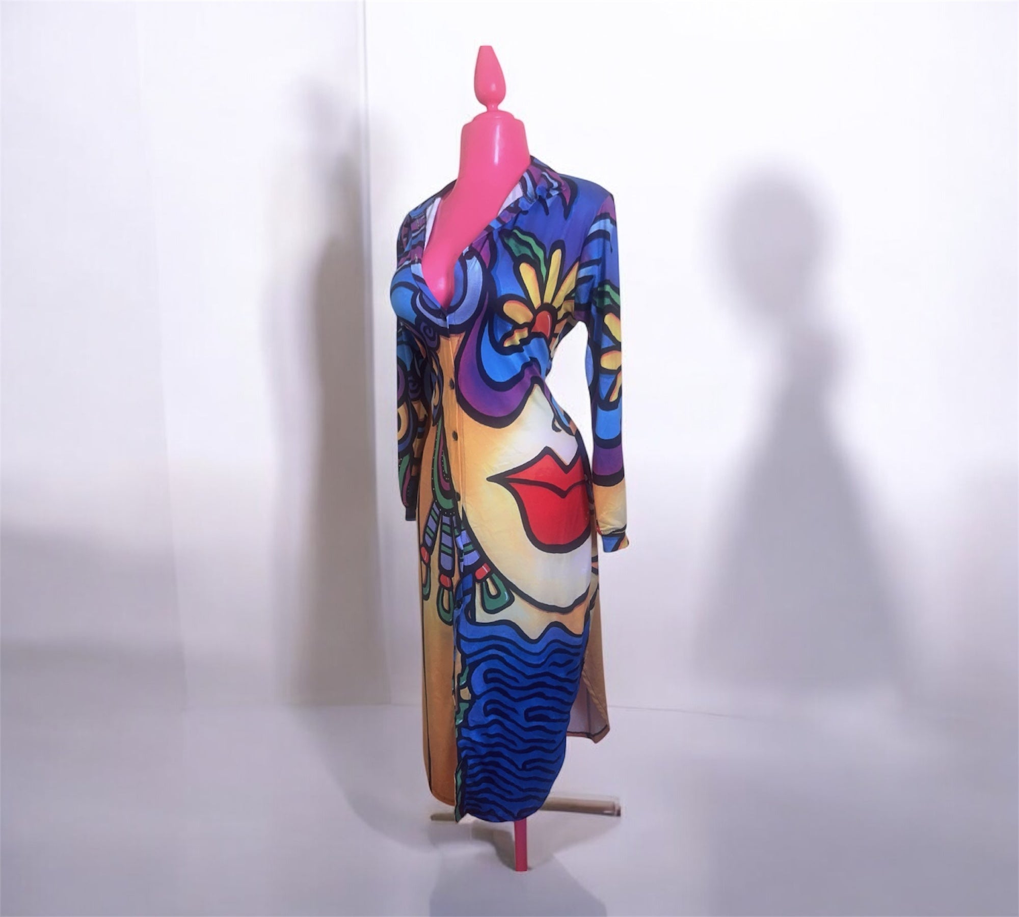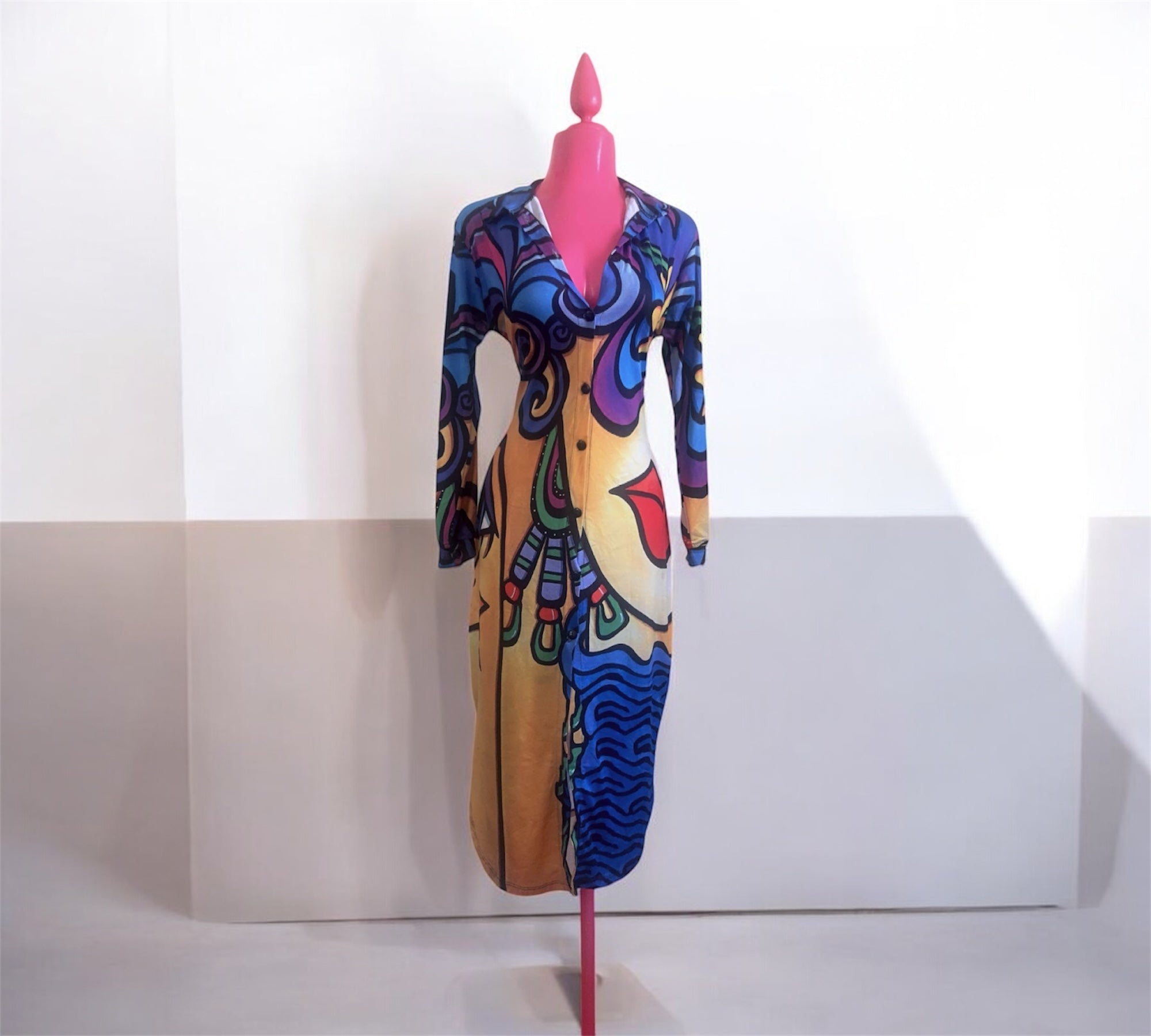 Mis Divas Fashion – Artistic Print Shirt Dress | Colorful Long Sleeve Midi with Side Slit