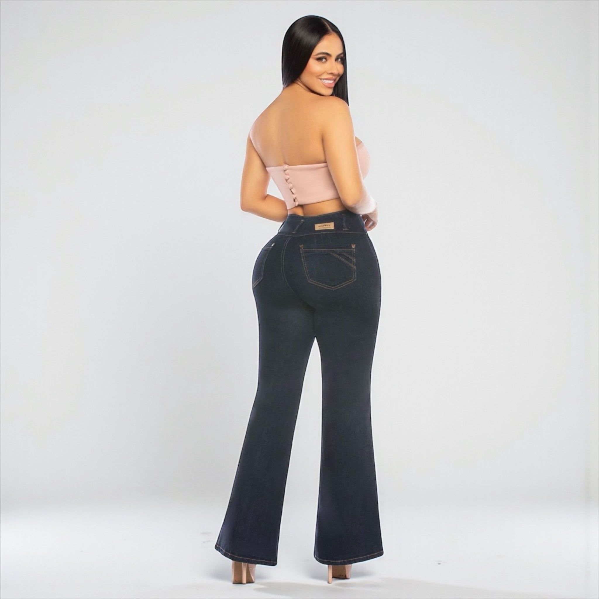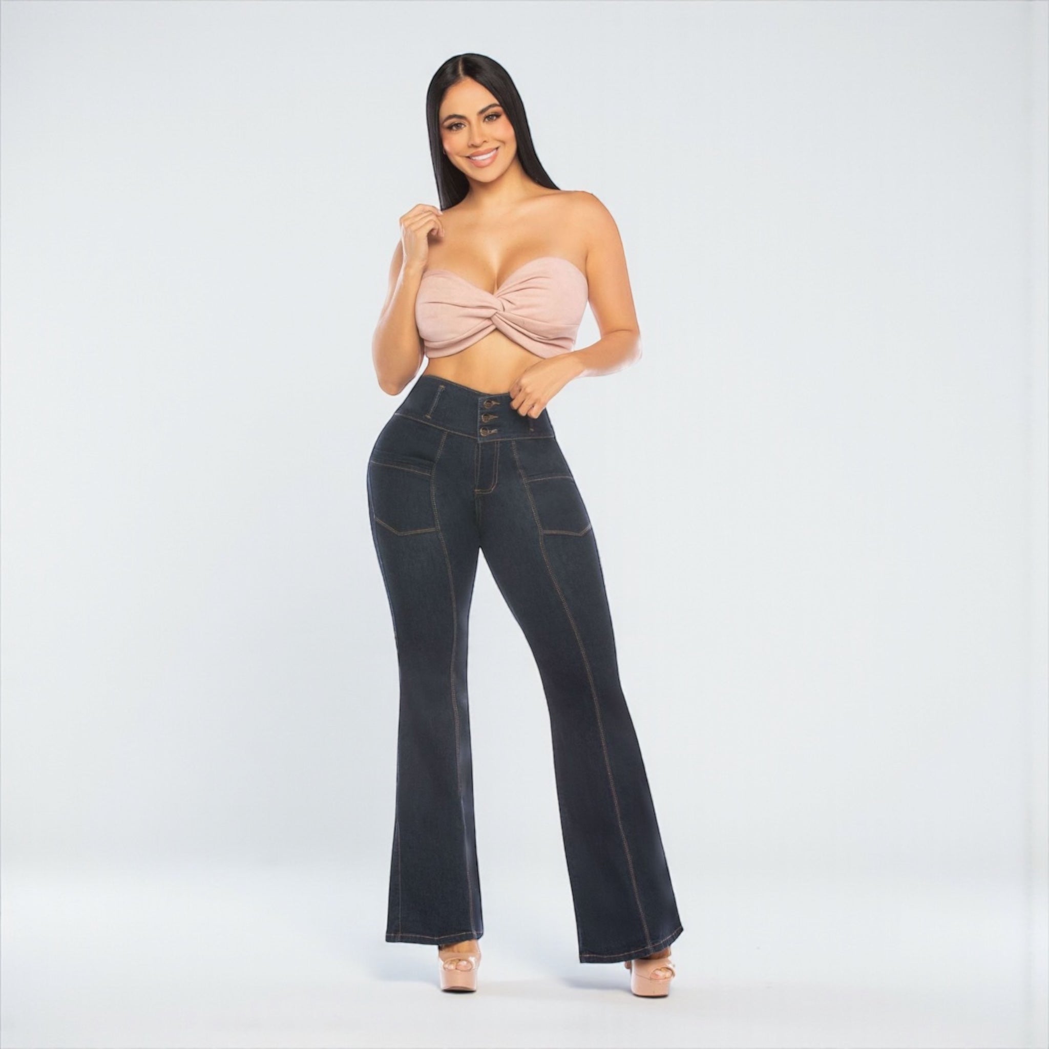 Introducing the Mis Divas Colombian Dark Blue Premium Flare Jeans, part of the Mis Divas Colombian Signature Jeans collection. Made with premium stretch denim and a high-rise waist, these jeans shape your figure, enhance your curves, and elongate your legs with a flattering flare cut.