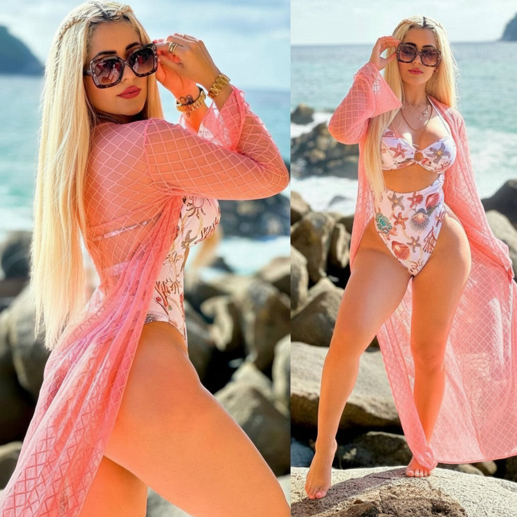 This swim cover up features a sheer mesh fabric with a long silhouette and open front design, making it easy to wear over any swimsuit. The lightweight material allows airflow while providing light coverage.