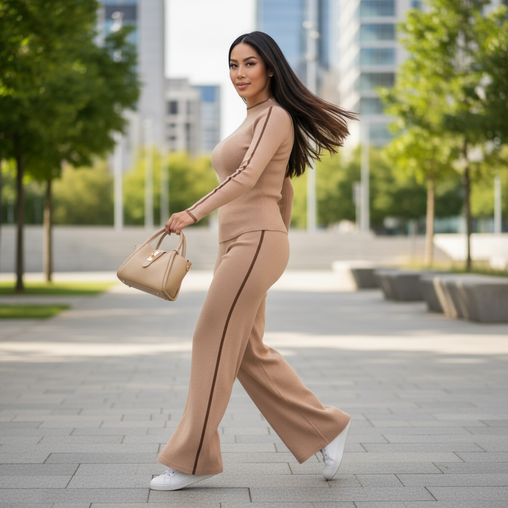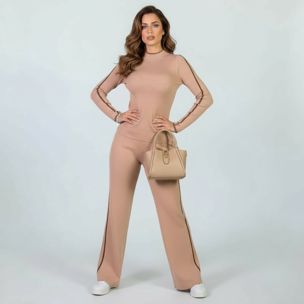 Our Diva Luxe Knit Set is the definition of soft sophistication. Designed with a fine ribbed knit fabric, this two-piece outfit features a mock neck top and high-waist flared pants that enhance your natural silhouette. Perfect for travel, brunch, or cozy chic days — it’s comfort and elegance in one.