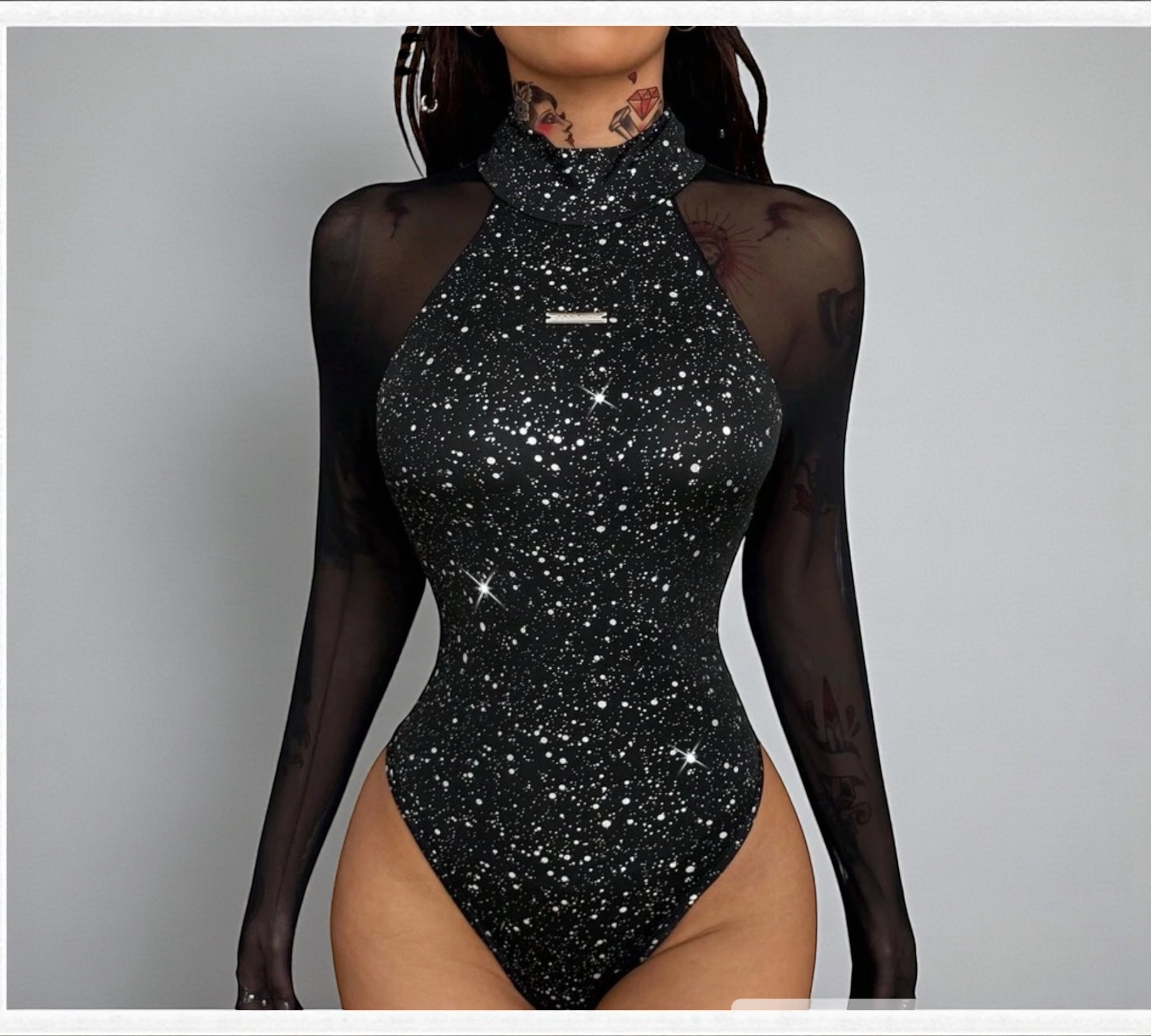 The Diva Galaxy Foil Bodysuit from the Mis Divas Bling Bling Collection is a sleek, modern piece featuring a metallic foil print that creates a galaxy-like shine without using rhinestones or sequins.