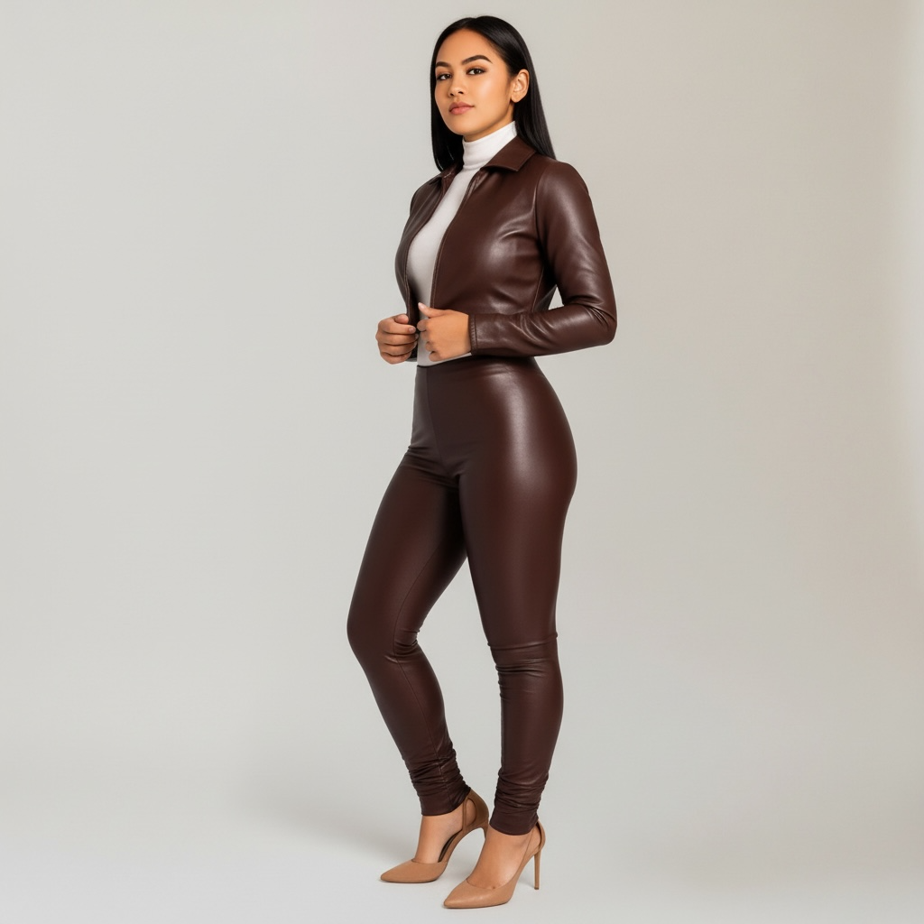 The Diva Luxe Eco-Leather Set in Chocolate delivers a sleek, structured silhouette with a refined, soft-touch finish. The premium vegan-leather fabric offers stretch, comfort and a polished look that elevates any outfit.