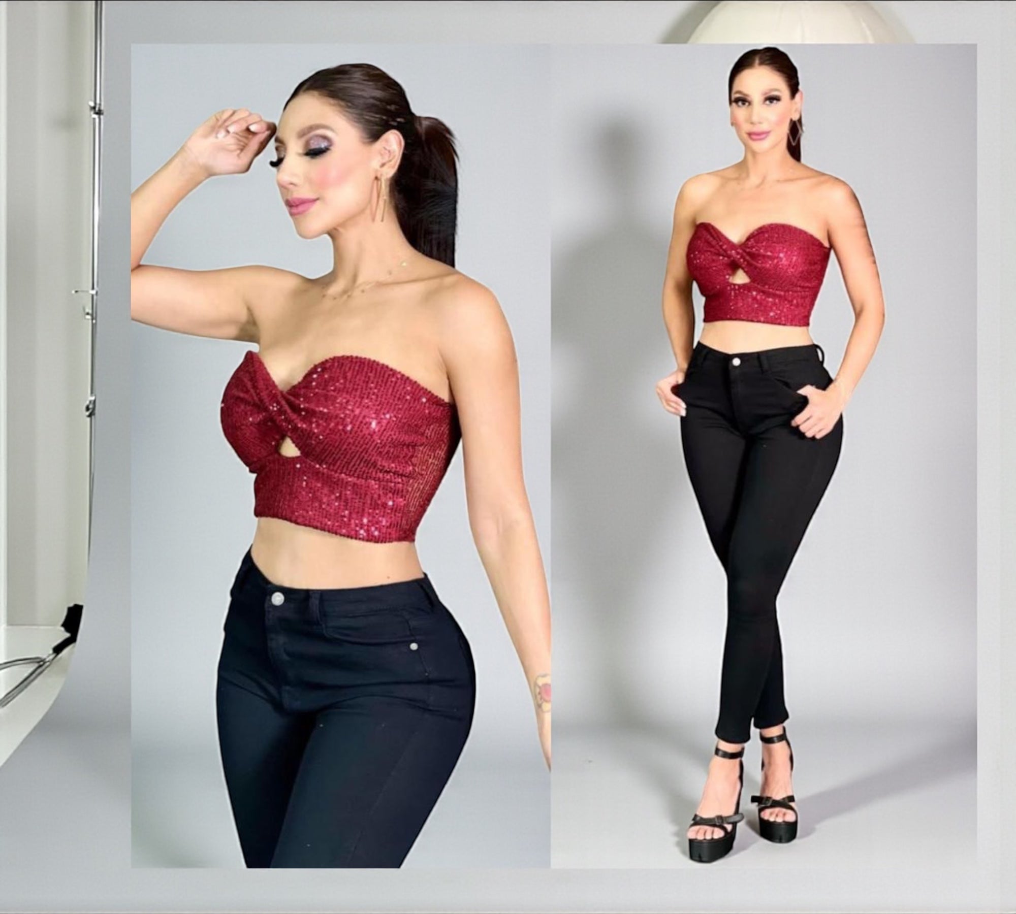 The Diva Sequin Twist Crop Top – Wine from the Mis Divas Bling Bling Collection is a glamorous, feminine and ultra-flattering piece. Its fine wine-colored sequins shine beautifully, while the strapless twist-front design enhances the bust, shoulders and waist.