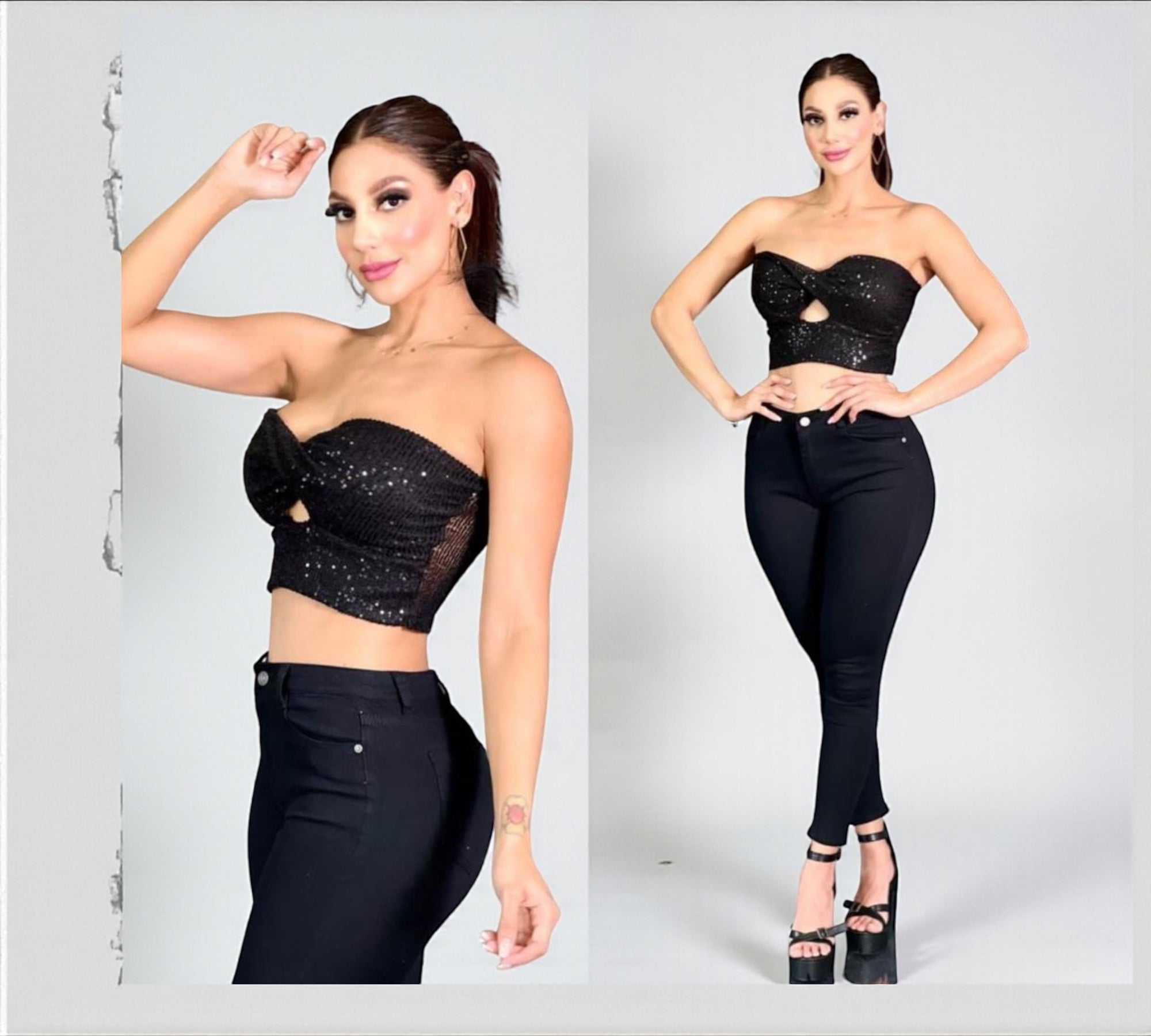The Diva Black Sequin Twist Crop Top from the Mis Divas Bling Bling Collection is a stunning and modern strapless piece. The twist-front detail enhances the bust and waist while the fine black sequins add a luxurious sparkle perfect for night events.