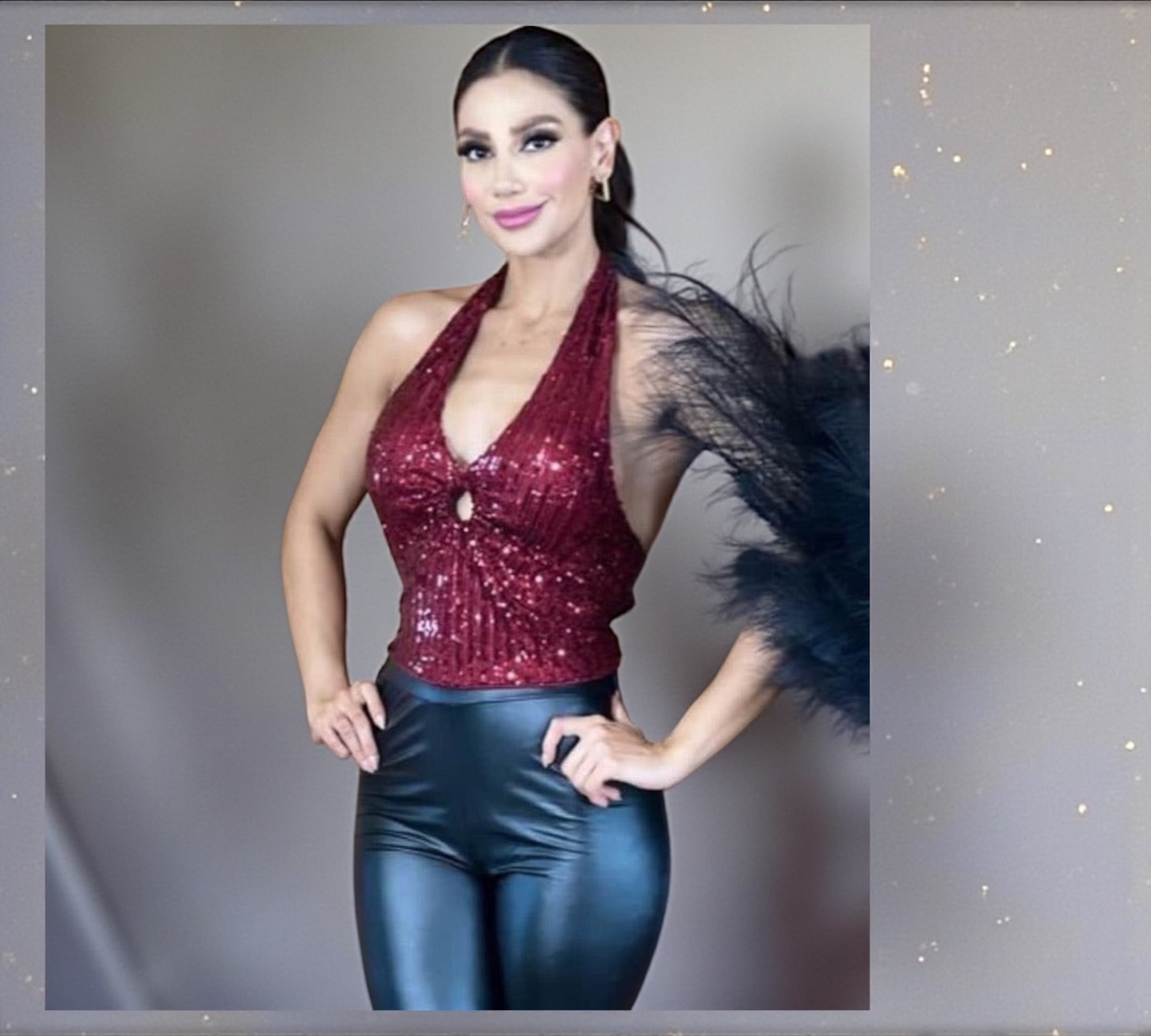 The Diva Sequin Halter Top – Wine from the Mis Divas Bling Bling Collection is a feminine, glamorous and eye-catching piece. Its fine wine-colored sequins add a stunning glow, while the deep halter neckline beautifully enhances the bust, shoulders and waist.