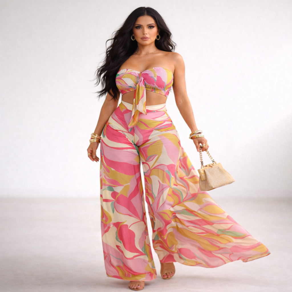 Turn heads this season with our Diva Tropic Flow Set, a vibrant tropical two-piece designed to make a statement. Featuring a flattering tie-front top and flowing wide-leg pants, this set brings effortless elegance and vacation energy to your wardrobe.