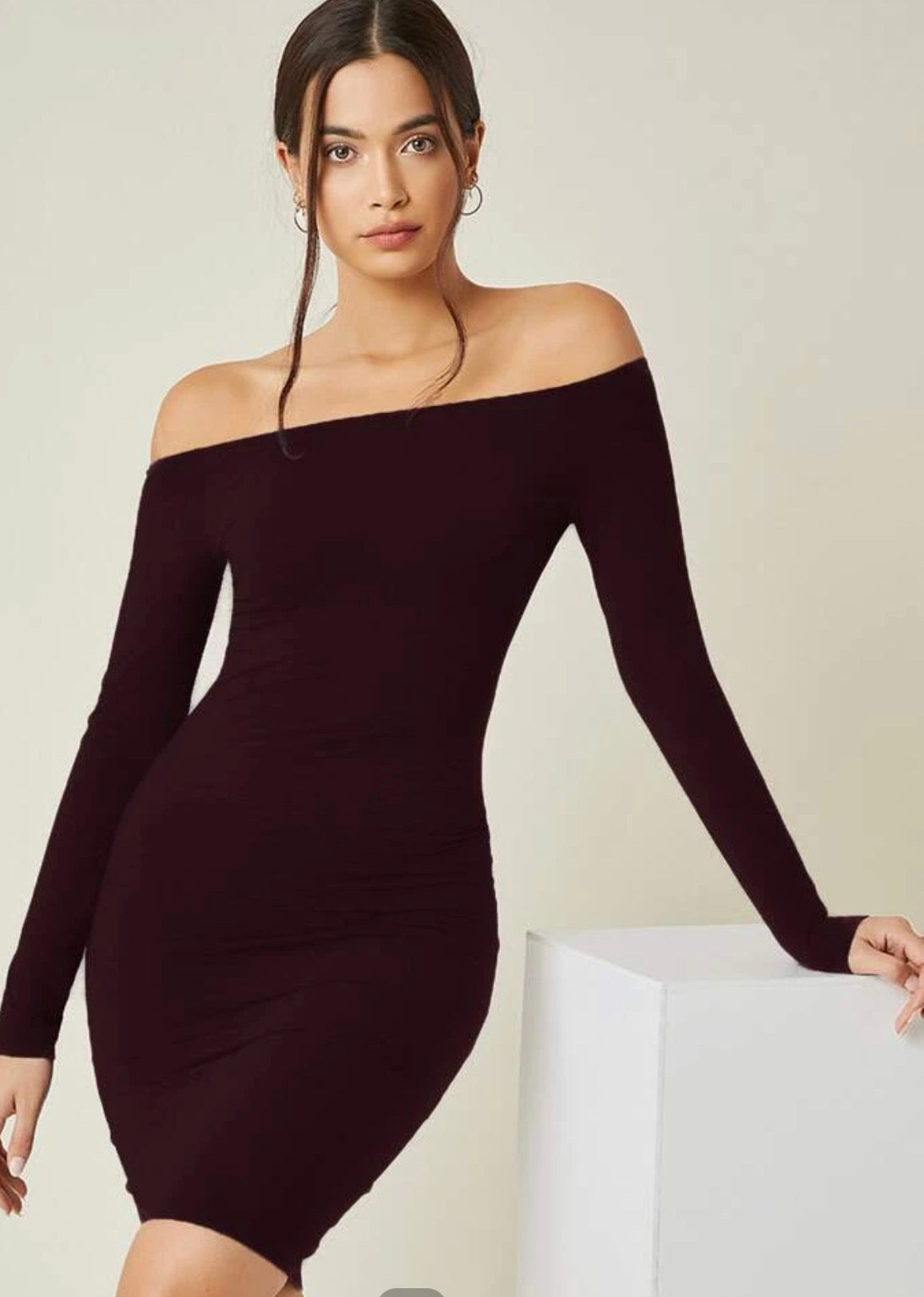 Vestido Wine Seduction – Midi ajustado con hombros descubiertos