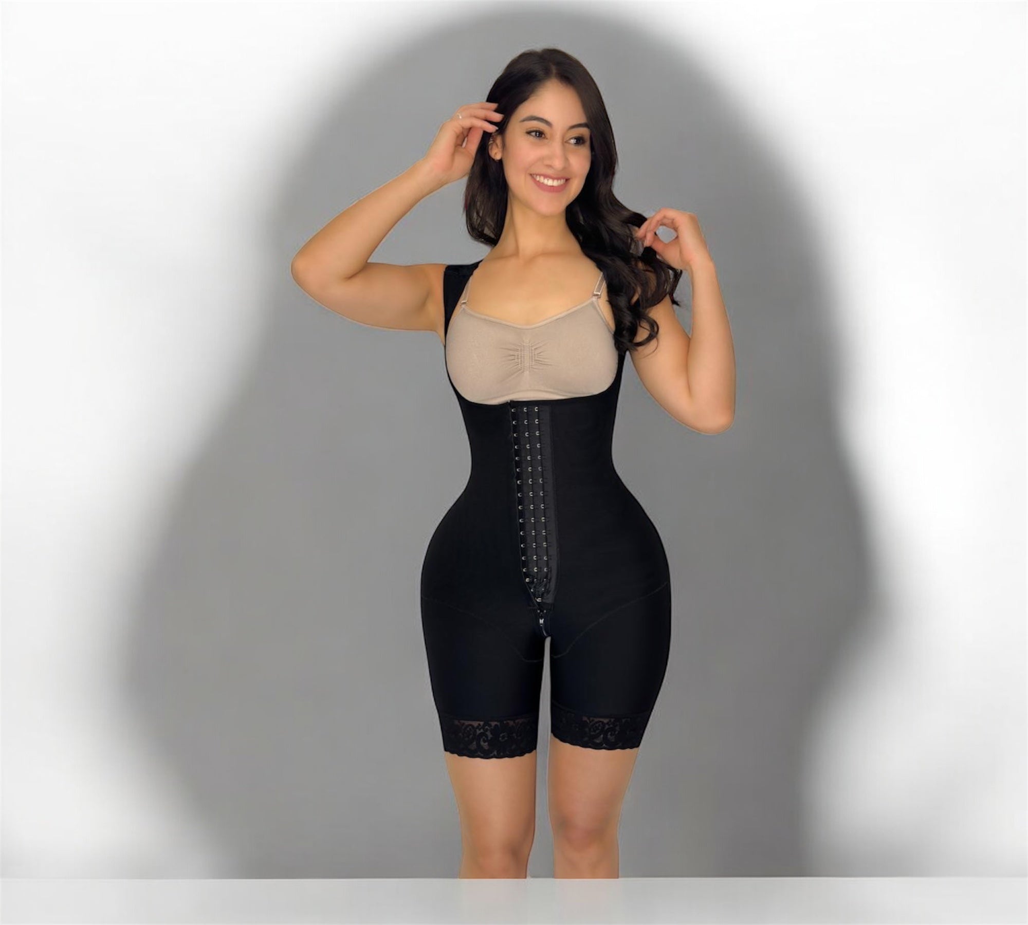Designed for post-surgery and postpartum recovery, it provides targeted compression to aid healing and improve posture, while remaining discreet under clothing. Its mid-thigh length with lace trim ensures smooth, seamless results, making it ideal for both recovery and everyday shaping.